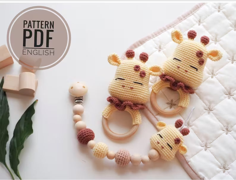 Bring joy to your baby's playtime with our Giraffe Giggles Baby Toy Crochet Pattern PDF! This detailed guide provides step-by-step instructions for creating a charming giraffe-themed baby rattle and pacifier clip. Ideal for both beginners and experienced crocheters, each pattern ensures you can craft these adorable and safe baby toys with confidence. Perfect for creating unique, handmade gifts that will be cherished by little ones. Start your crochet journey today and create these delightful giraffe toys!